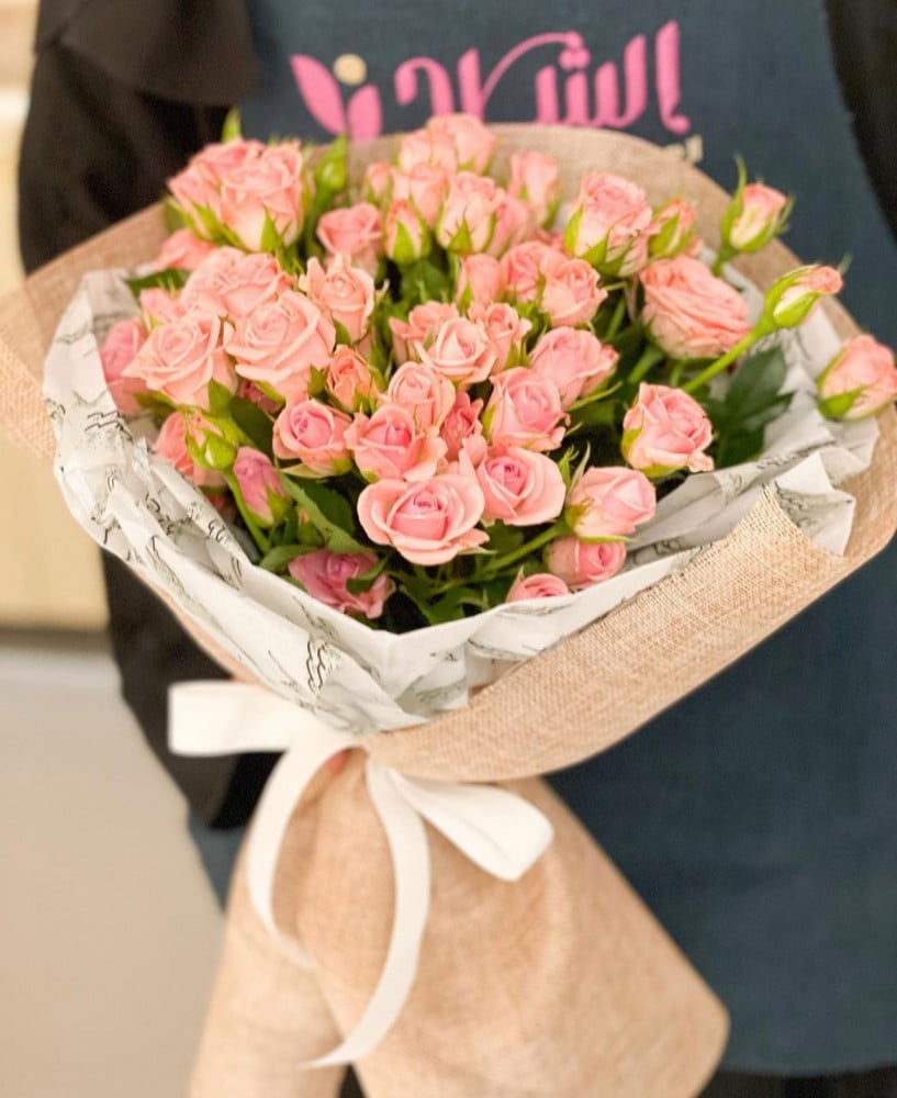 بوكيه ورد متكون من اغضان البيبي روز الجذابه بتغليف الخيش