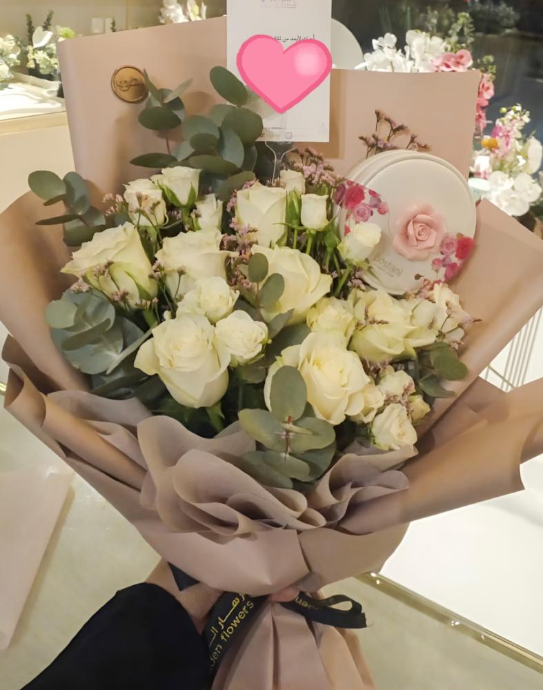 بوكيه ورد متكون من مجموعه من الورد الهولنديه بدرجات اللون الابيض + شوكلت الورده من بستاني