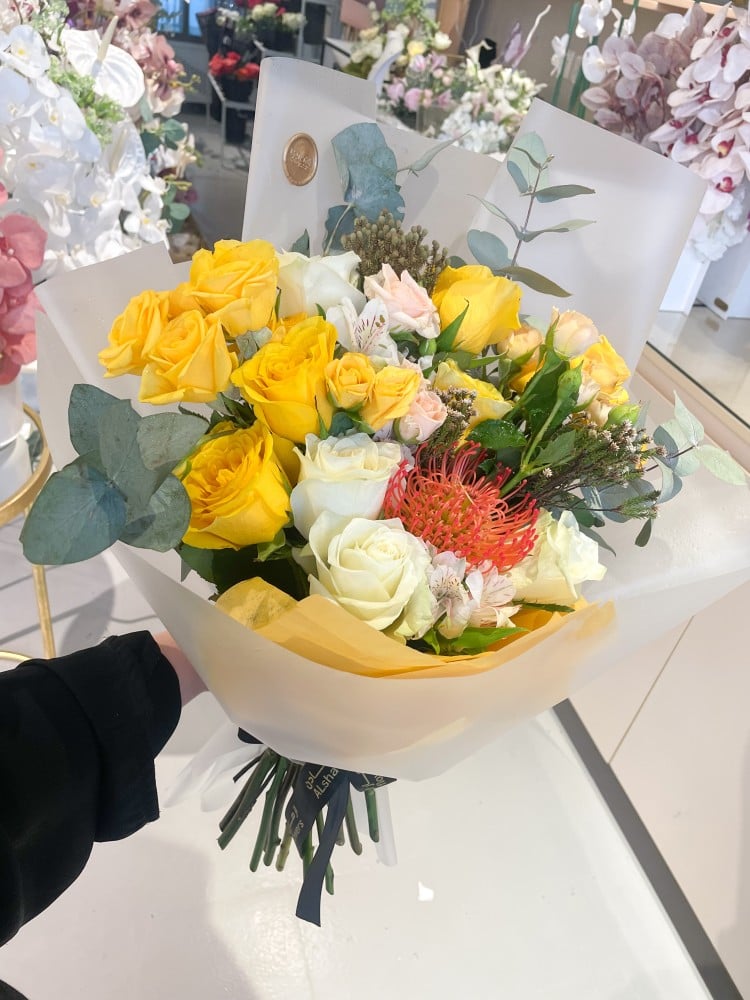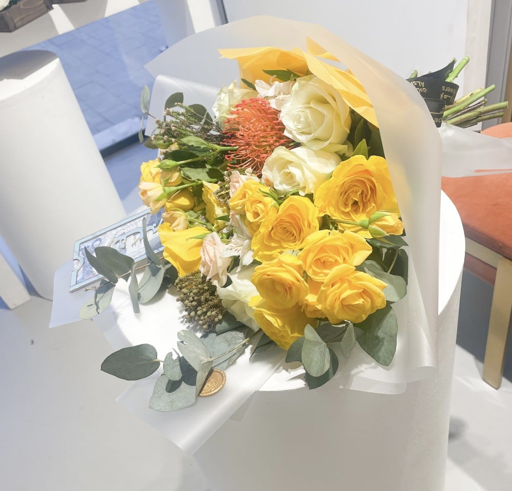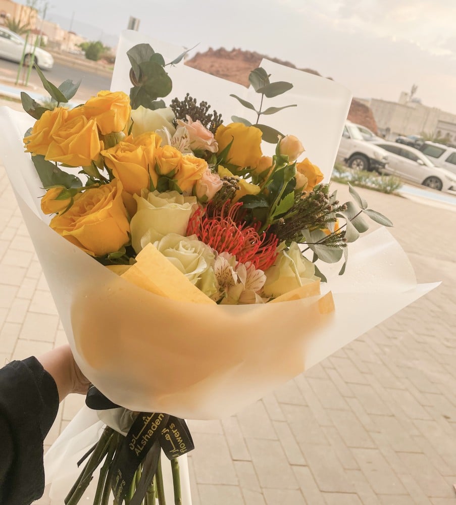 بوكيه ورد متكون من مجموعه من الورد الهولنديه بدرجات اللون الاصفر و الابيض و الاورنج
